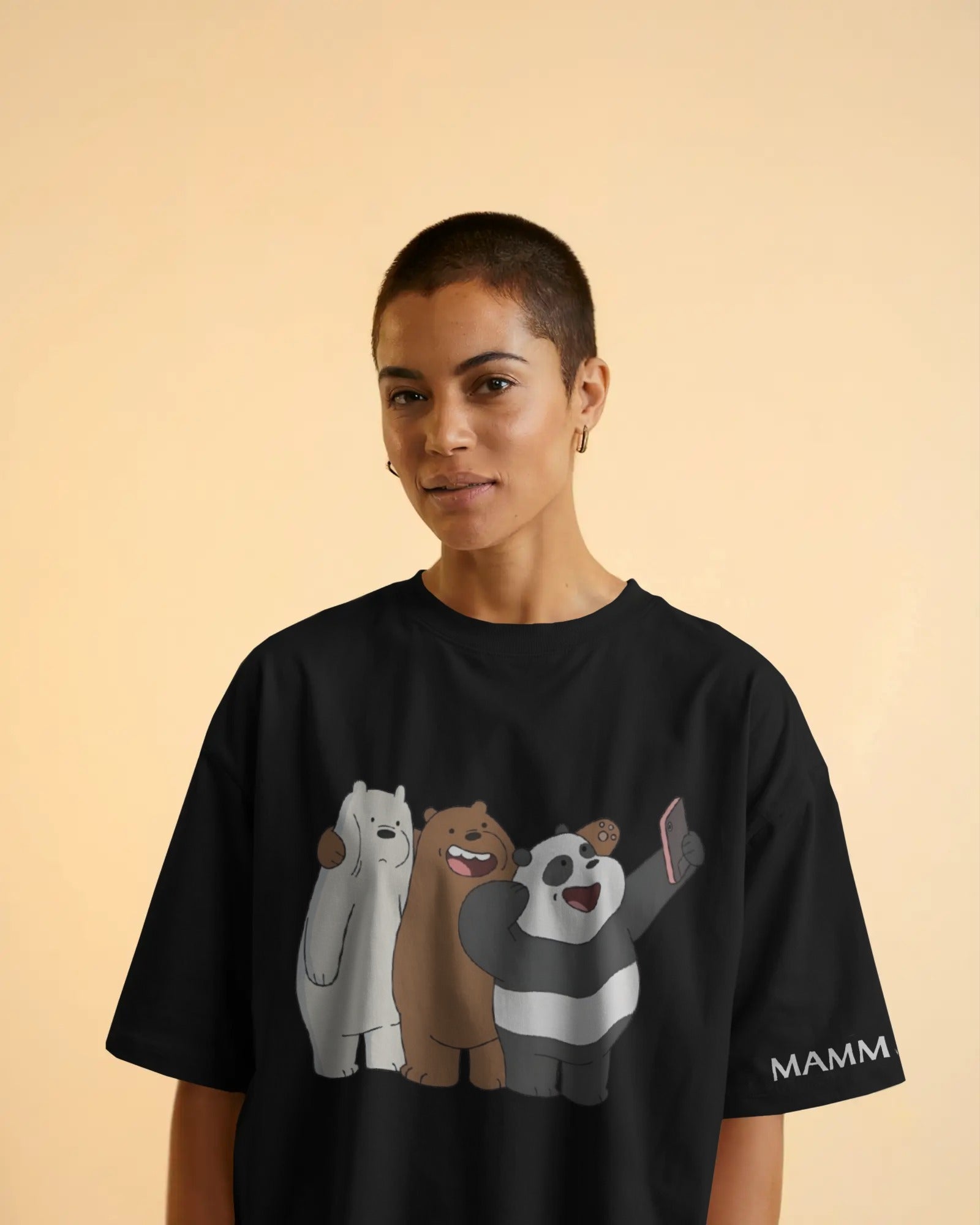 This playful front-and-back tee brings pure animated joy with a squad of three expressive bears living their best life. The front shows them posing for a cheerful selfie moment — a reminder of real friendship, mischief, and digital-era bonding. Flip it around, and you’ll find them tumbling out of a door in classic cartoon chaos, bringing movement, humor, and personality to the piece.