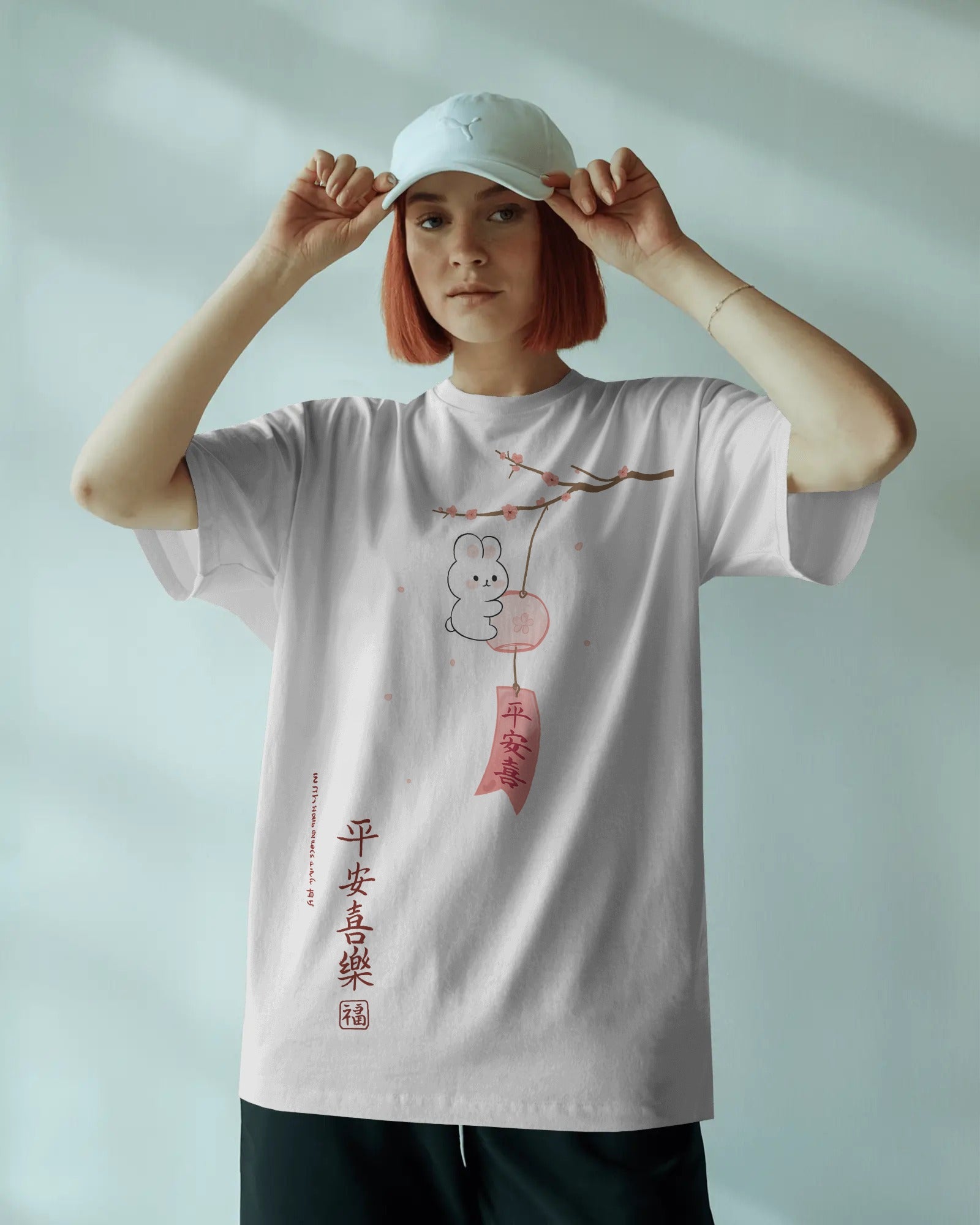 This serene T-shirt design features a peaceful bunny sitting beneath a blossoming cherry branch and a soft pink moon, framed in a gentle arch. Paired with elegant Chinese characters meaning "Peace, Joy, Happiness, Prosperity", it captures the essence of inner calm and graceful simplicity. A perfect blend of cute and contemplative, this design speaks to those who find beauty in stillness and harmony.