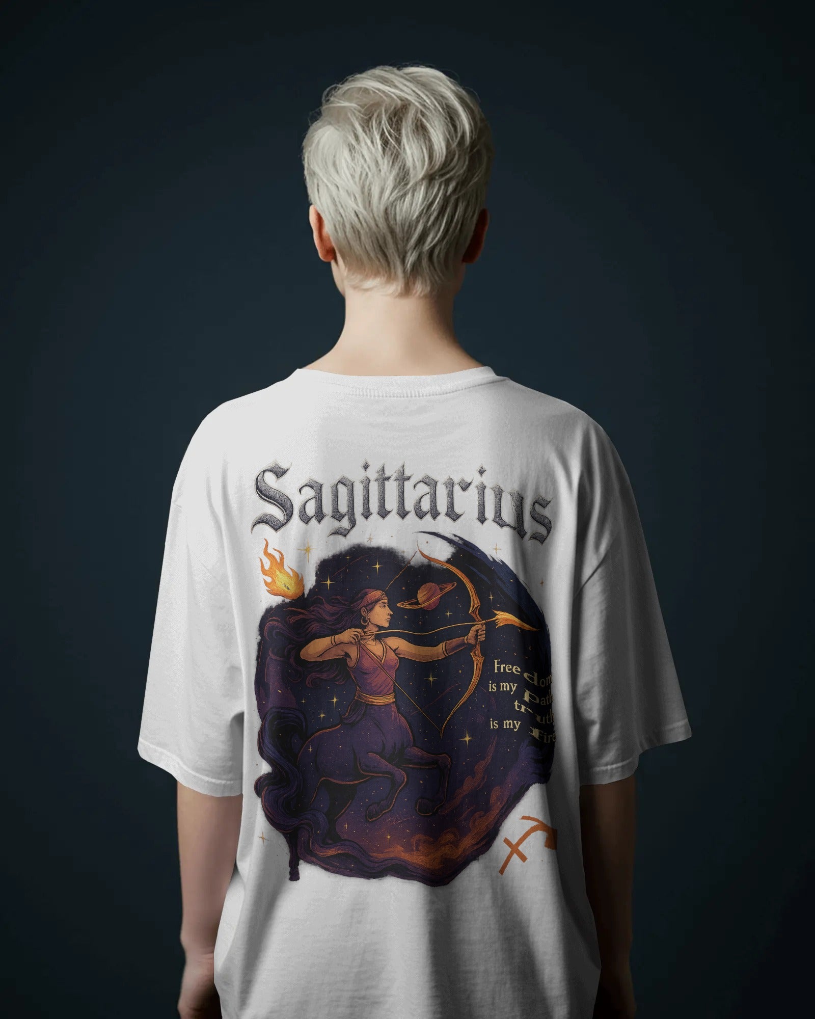 This striking Sagittarius-themed design features a powerful centaur archer aiming toward the stars, surrounded by cosmic elements like planets and flames. With the phrase “freedom is my path, truth is my fire”, it captures the bold, adventurous spirit of the Sagittarius sign. Ideal for astrology lovers who live fearlessly and follow their inner truth.