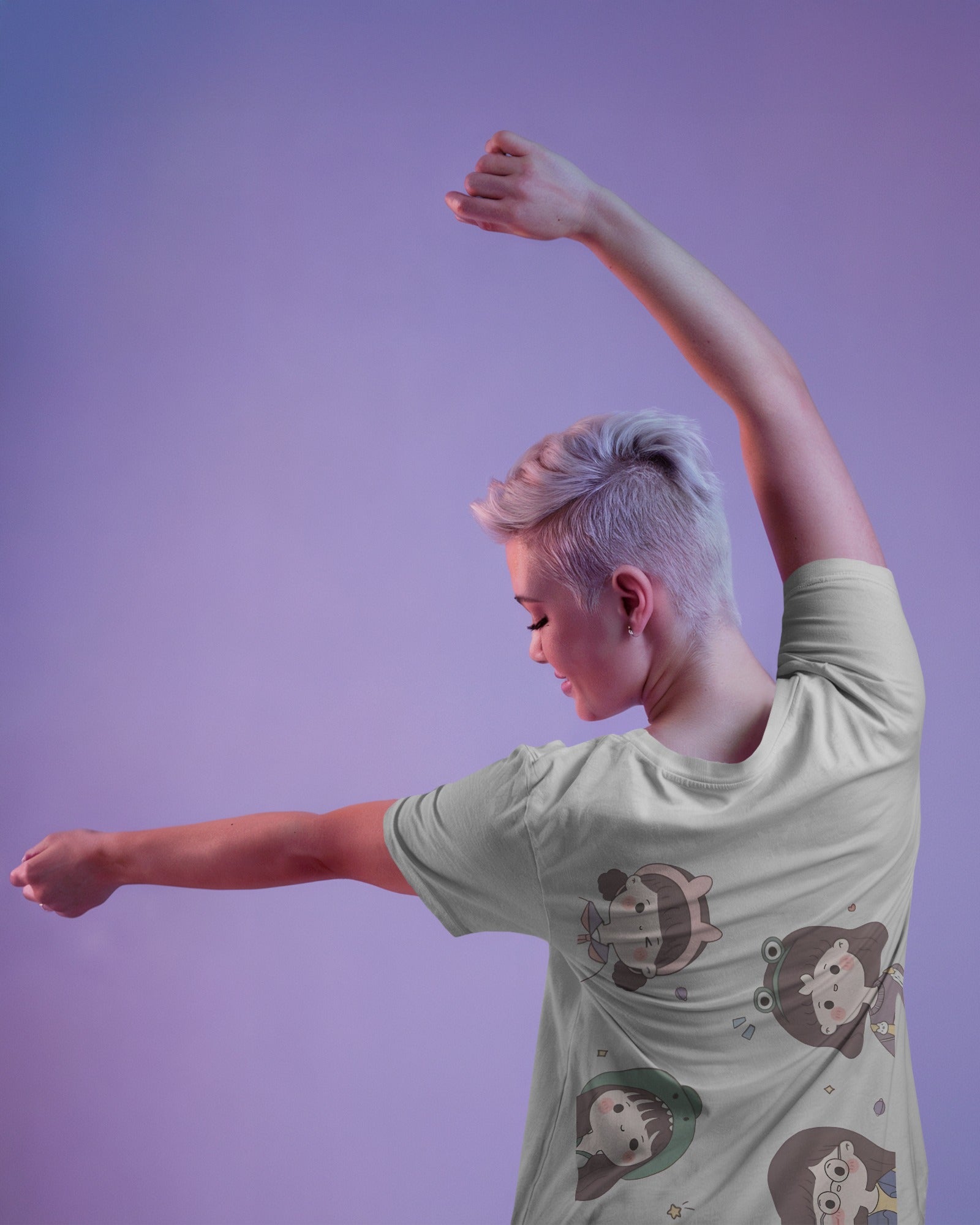 Spread joy and charm with the "Happy Girl Vibes" t-shirt, featuring a delightful lineup of cartoon girls in playful animal and fantasy-themed outfits. The front design proudly says “To be a happy girl”, accompanied by whimsical characters and cute accents like stars, moons, and a shy little bunny. On the back, the individual portraits continue the theme with unique expressions and quirky details that highlight individuality and fun.
