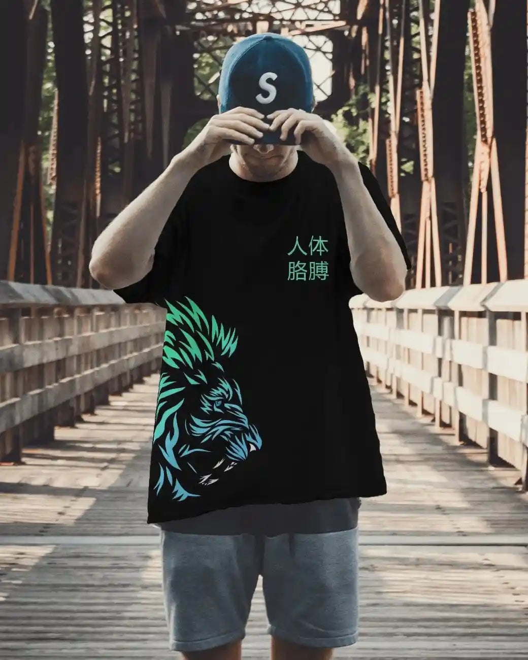 This streetwear T-shirt features a bold and edgy design perfect for urban explorers. The front showcases a fierce, neon-gradient beast graphic, paired with minimal Japanese text for a modern street aesthetic. The back reveals a striking “grinning face” design with dripping X-eyes and sharp teeth, giving the tee a rebellious, statement-making vibe. The vibrant green-blue gradient on black fabric enhances its night-time and city-wear appeal, making it a must-have for trendsetters who love a mix of street style and artistic expression.