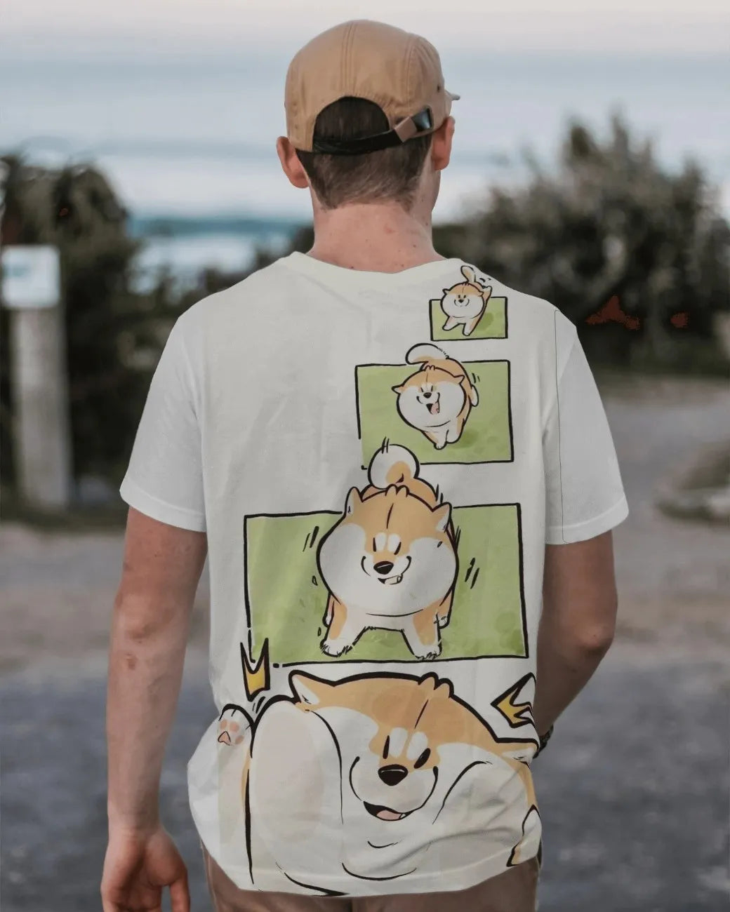 This playful and dynamic design captures the sheer joy and energy of an excited Shiba Inu mid-jump, leading to a soft, adorable crash landing! The illustration, styled in a charming cartoon aesthetic, showcases the pup’s enthusiastic zoomies as it barrels forward with pure happiness.