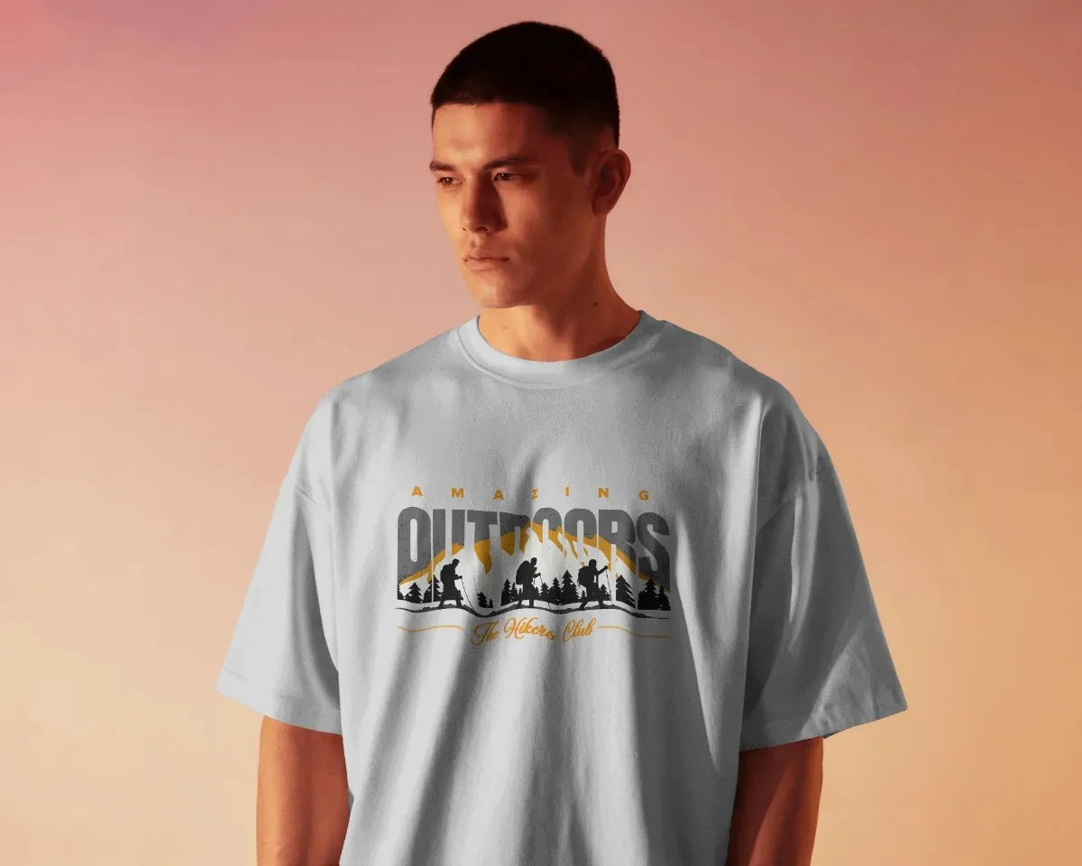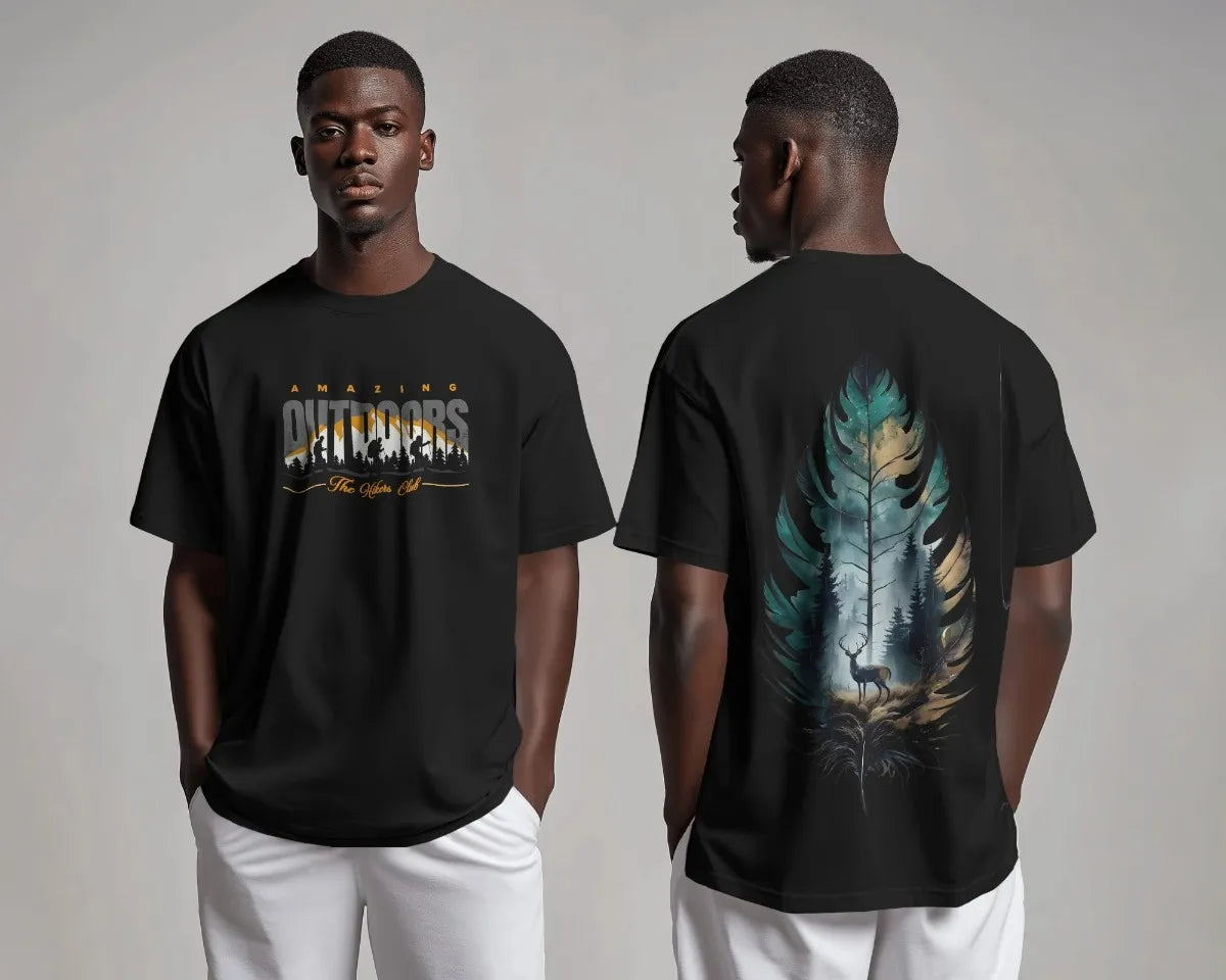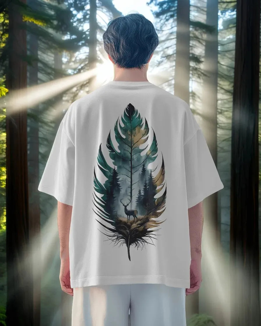 The vibrant design on the forefront of the feather t-shirt is captivating and exudes calming, nature-derived colors. It features a stylized feather that transitions into a detailed wilderness view containing a stag, symbolizing beauty, freedom, and the gentle reconciliation with the wild. So, this is a silhouette t-shirt, one style described as featuring fundamental elements of outdoor attire combined with quiet strength. It evokes strong feelings of a bond with nature.